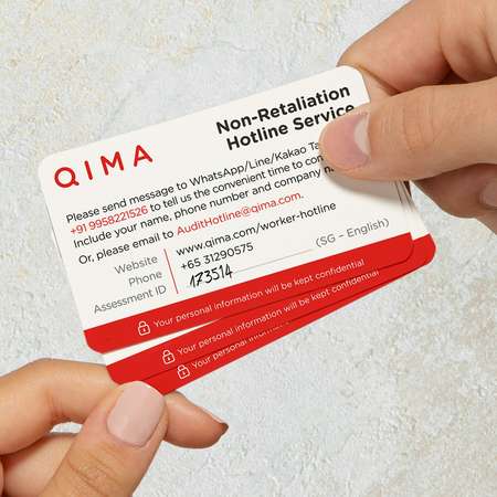 Durante as entrevistas com os trabalhadores, nosso auditor distribui um cartão de linha direta e explica ao trabalhador que ele também receberá um retorno de chamada confidencial após a conclusão da auditoria. O auditor pergunta o número de telefone, o horário preferido para a ligação (por exemplo, fim de semana, noite, intervalo de almoço) e o idioma preferido para a ligação. O trabalhador também é informado sobre o número da Linha Direta do Trabalhador da QIMA, para o qual poderá ligar se tiver algum problema.