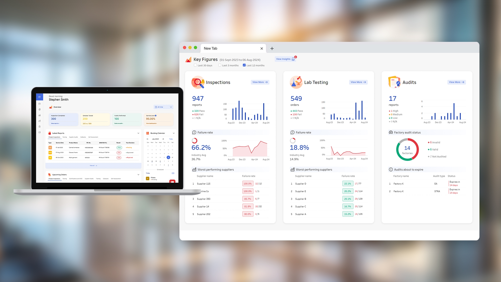 Acesse facilmente dados em tempo real, detalhados e de alto nível por meio do nosso painel infinitamente personalizável. Acompanhe os KPIs de sua cadeia de suprimentos ao longo do tempo, inclusive o desempenho do fornecedor, a taxa de defeitos, o status da auditoria, a taxa de falhas e muito mais.